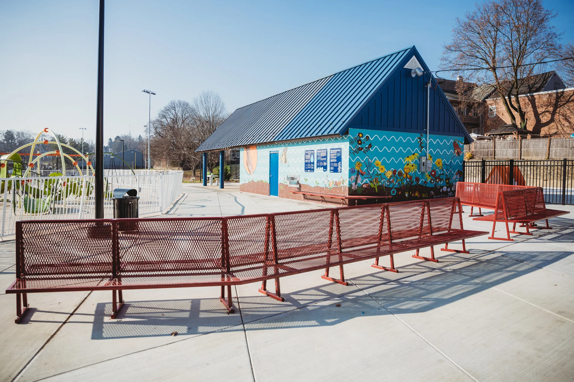 In 2020, during the pandemic, collectively with neighbors Salina Almanzar created a mural on a facilities building. A serpentine bench created by Matthew Geller is in the foreground.
