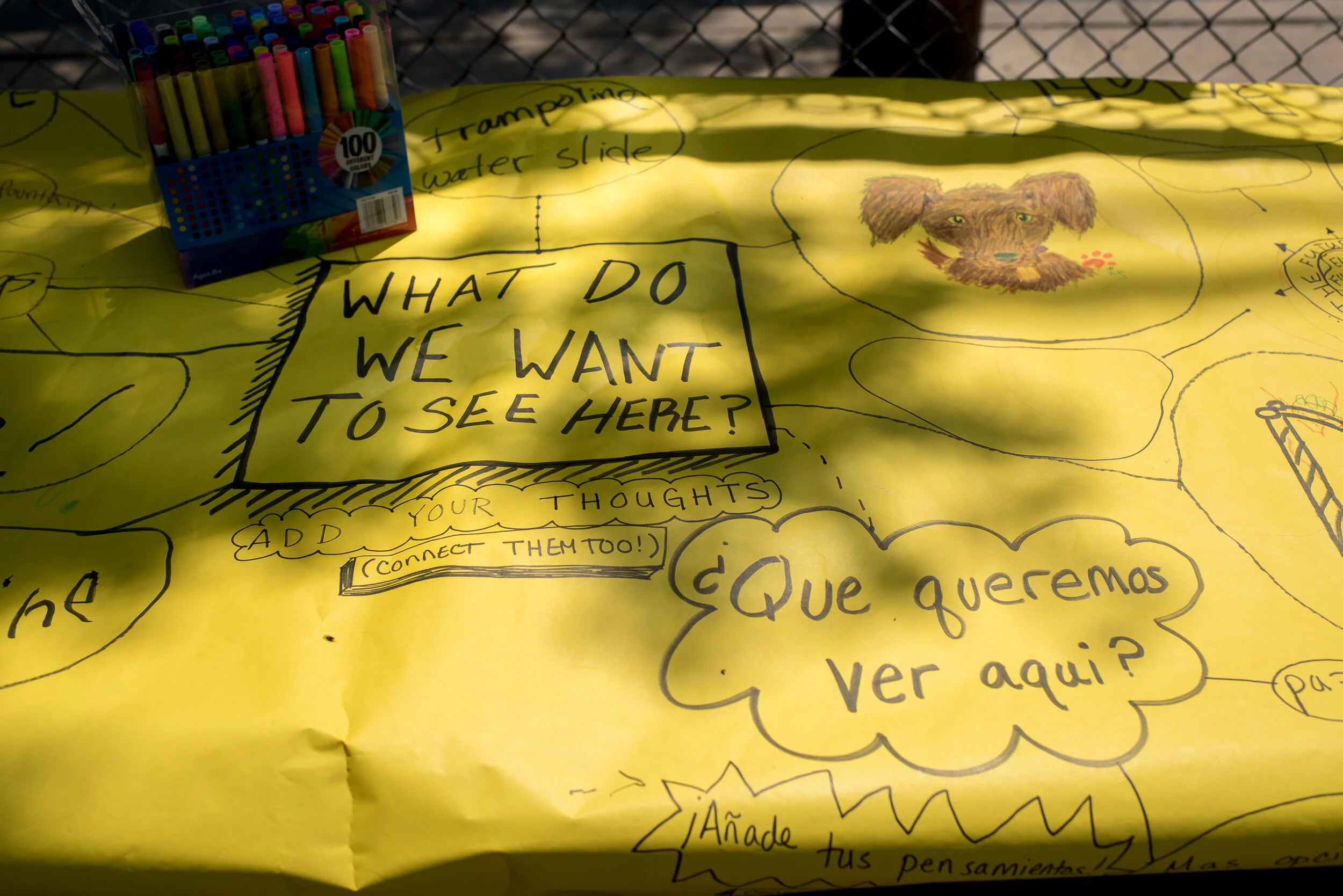 Community input was critical to ensure that neighbors could feel ownership over the park. We worked closely with the SoWe neighborhood group to gather input, share designs, and get feedback, but also found creative ways to reach neighbors of the park that may not be connected with the SoWe group or were unable to attend meetings. Salina Almanzar was commissioned to create small, temporary public art projects that could start conversations about the upcoming park renovation. These projects and conversations started in Spring 2018 and evolved into a project, called “Art Pop,” that continued through Fall 2019 when park construction began.