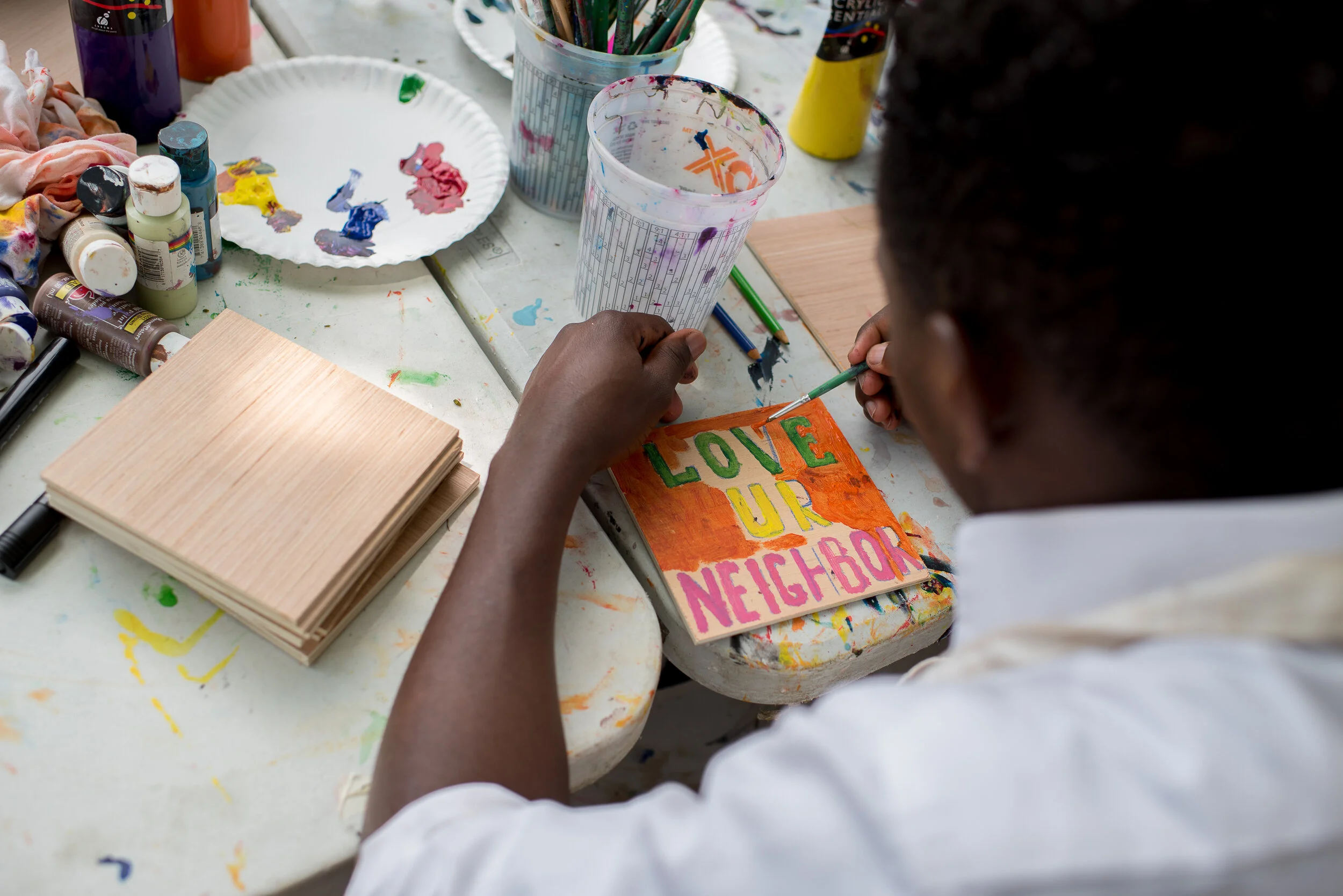 Community members create pieces that talk about their neighborhood and the future of the park during one of Salina Almanzar's "Art Pop" events. (Photo: Sara Code-Kroll)