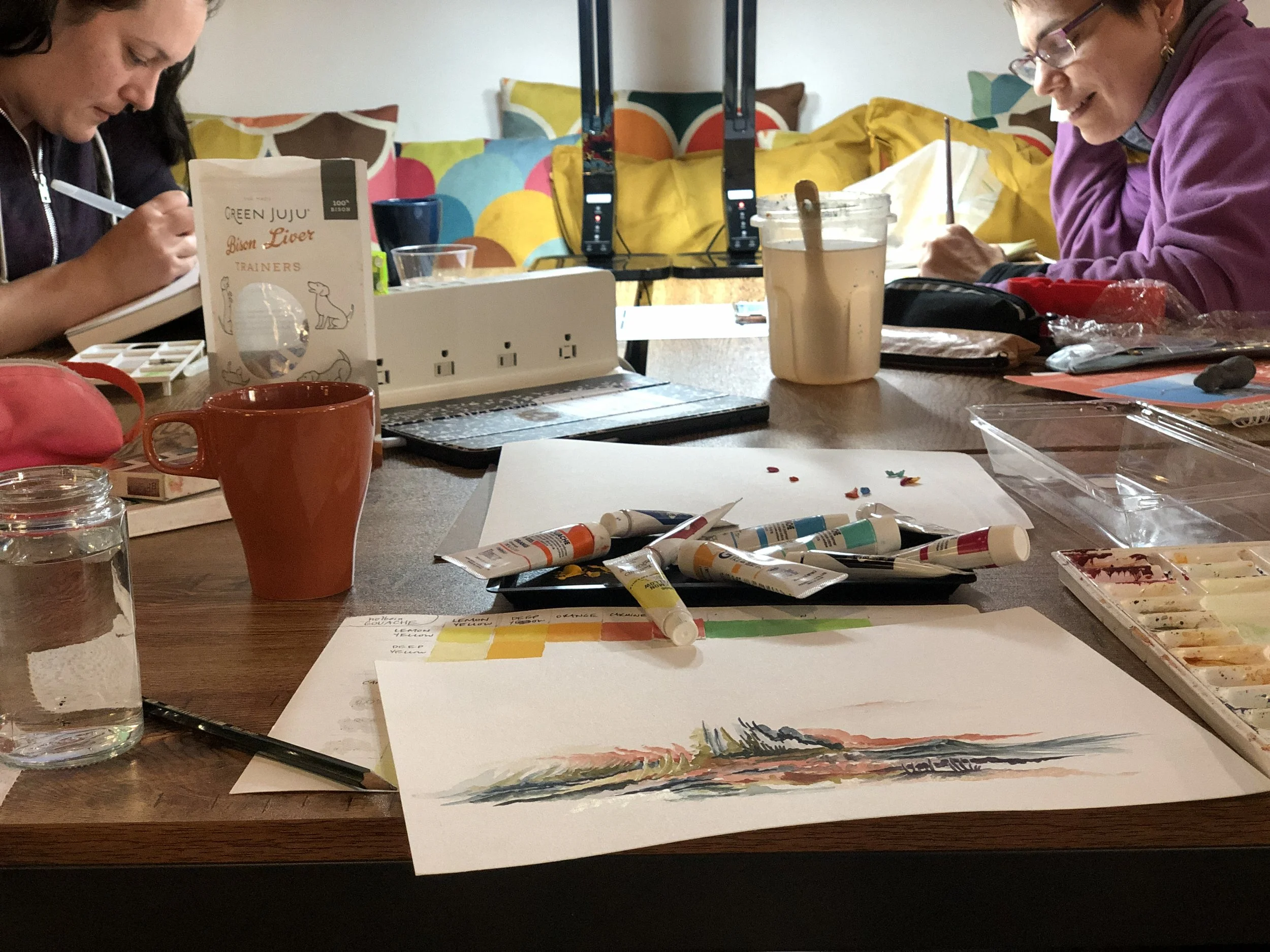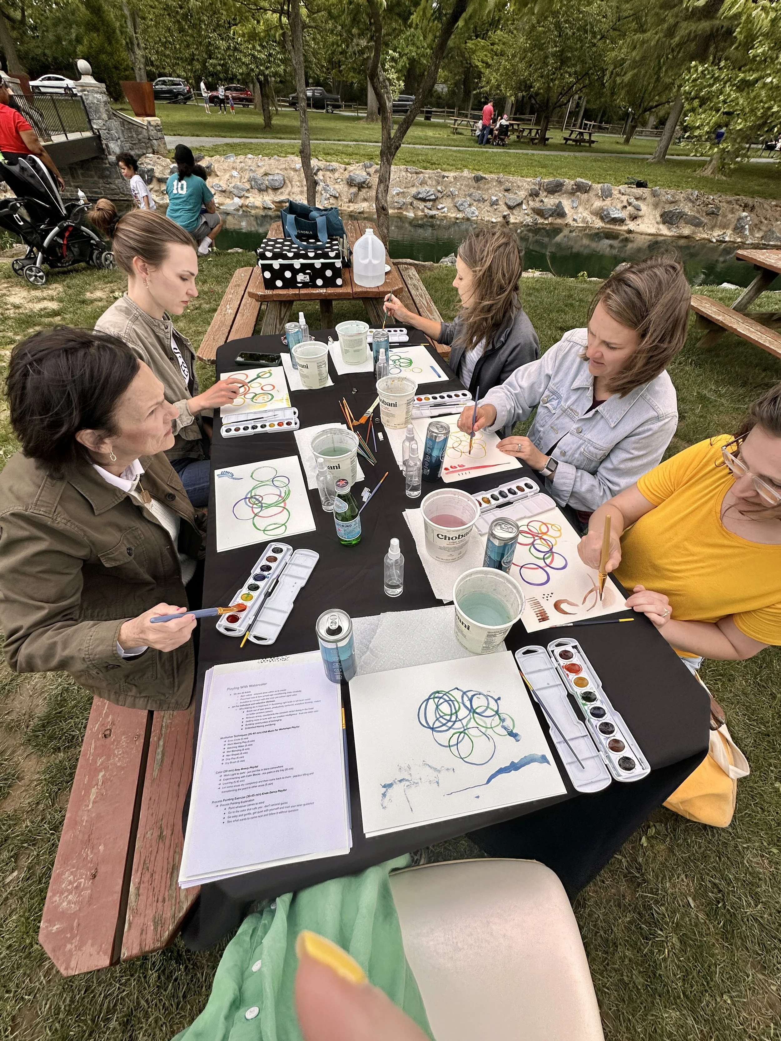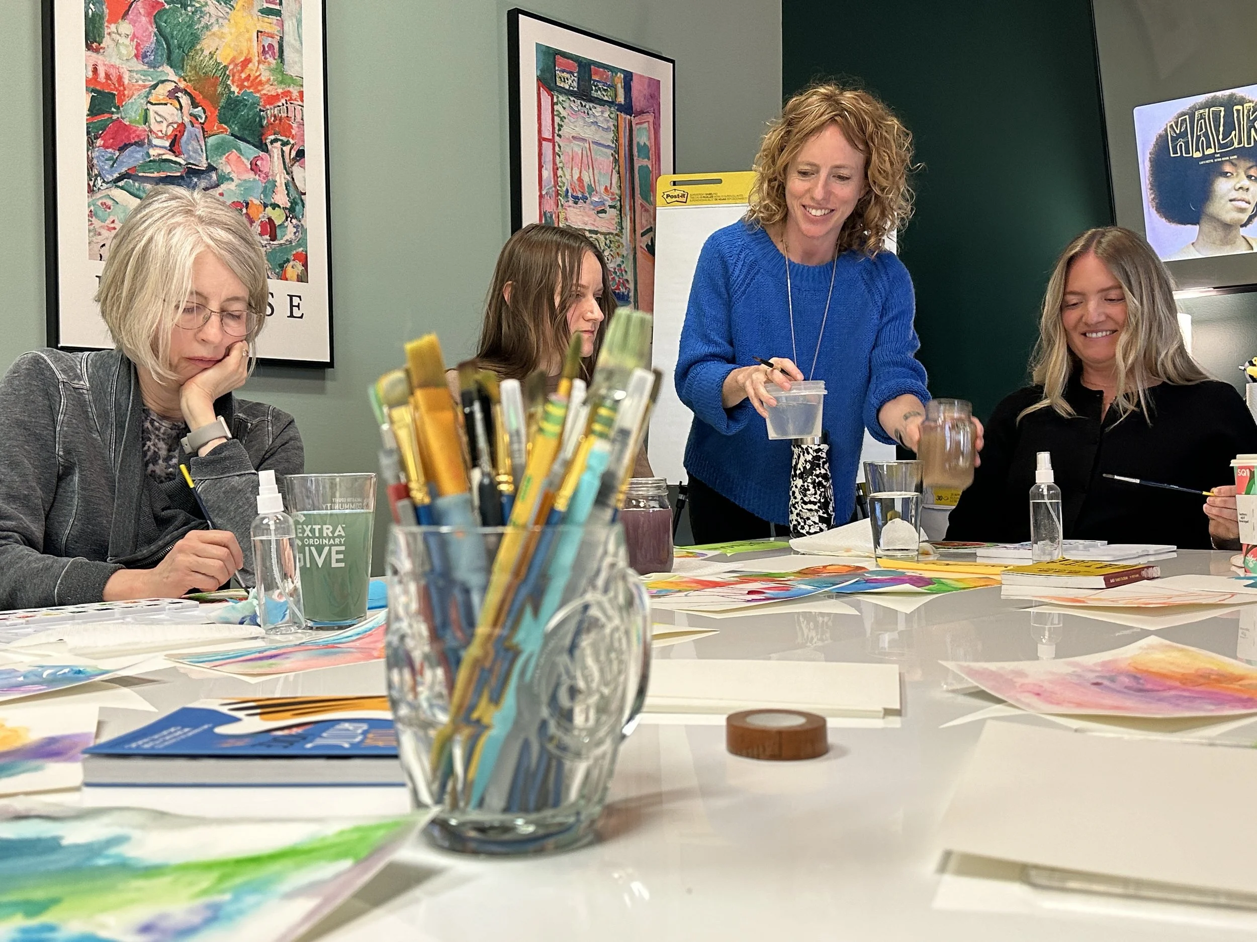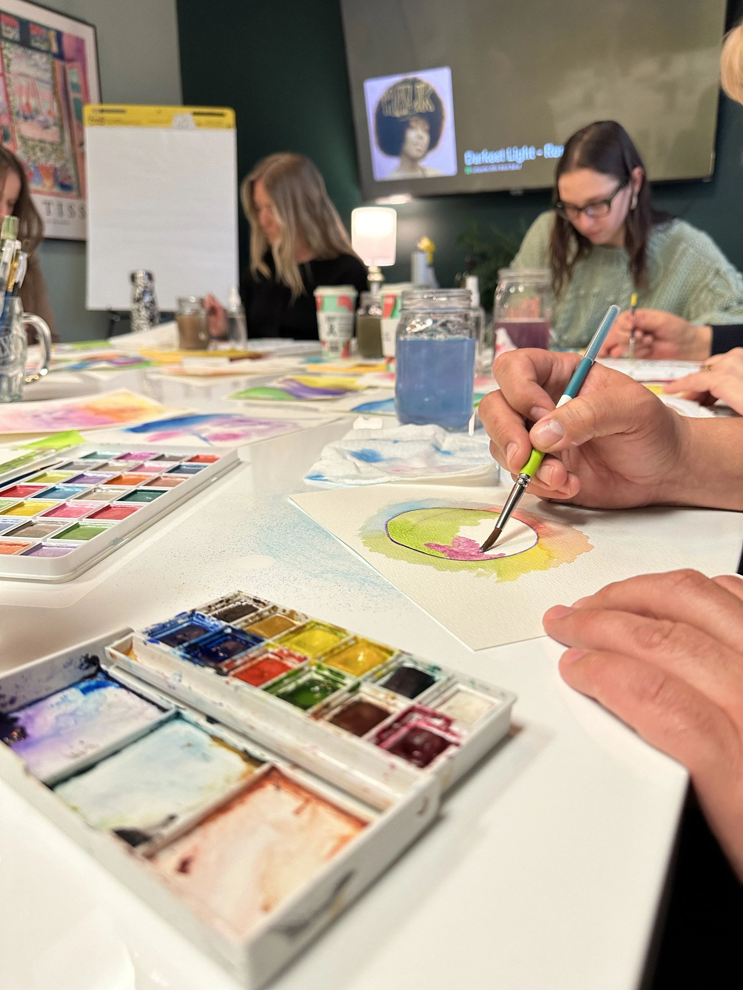A focused, meditative, play-based watercolor experience. Loose, conversational, and really accessible. Perfect for a group that wants something a little more relaxed.