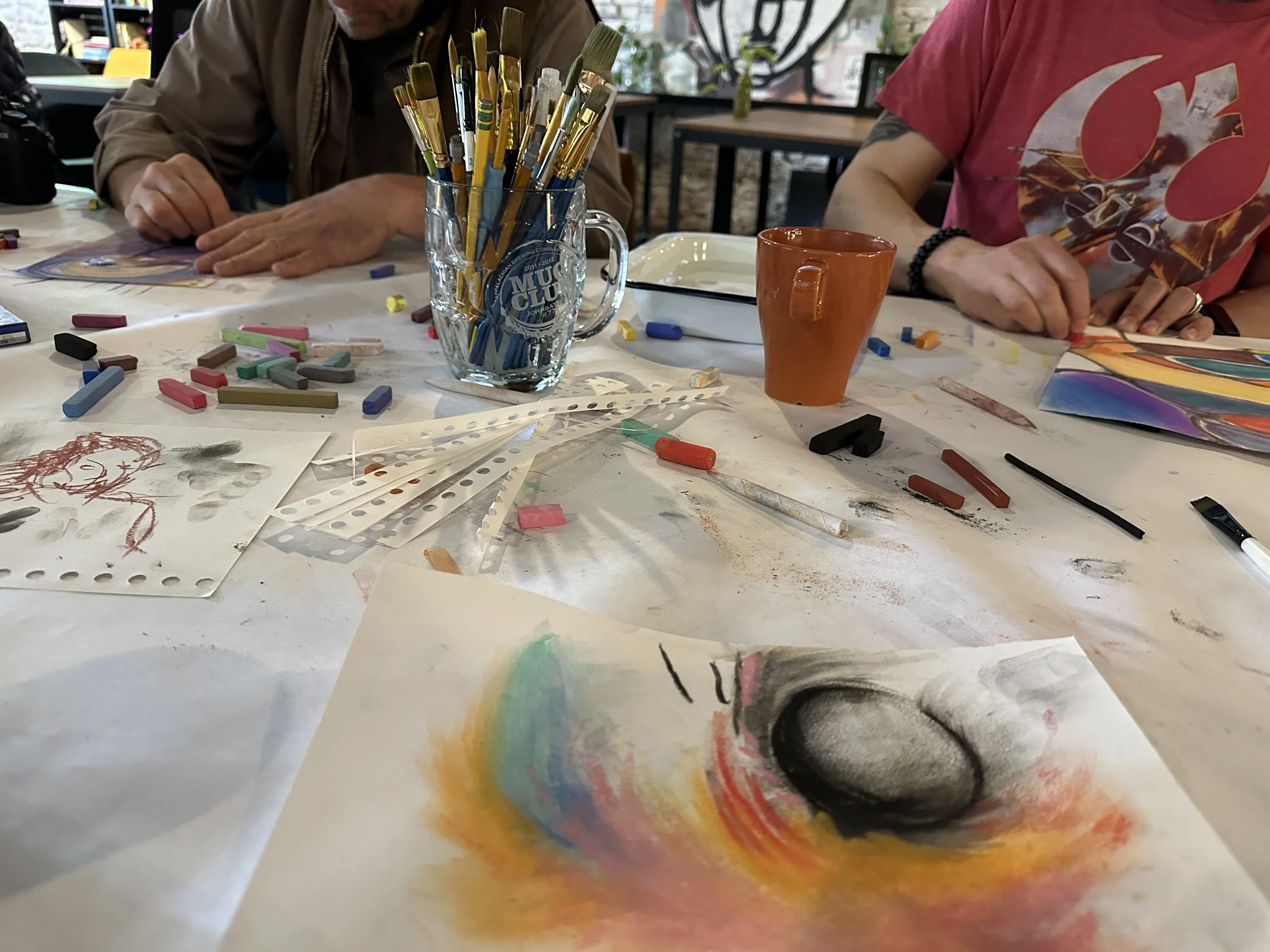 Experiment with a range of materials together, watercolor, acrylic, oil pastel, with some simple breathwork woven in to help everyone drop in. Process-based, playful, and no art experience needed.