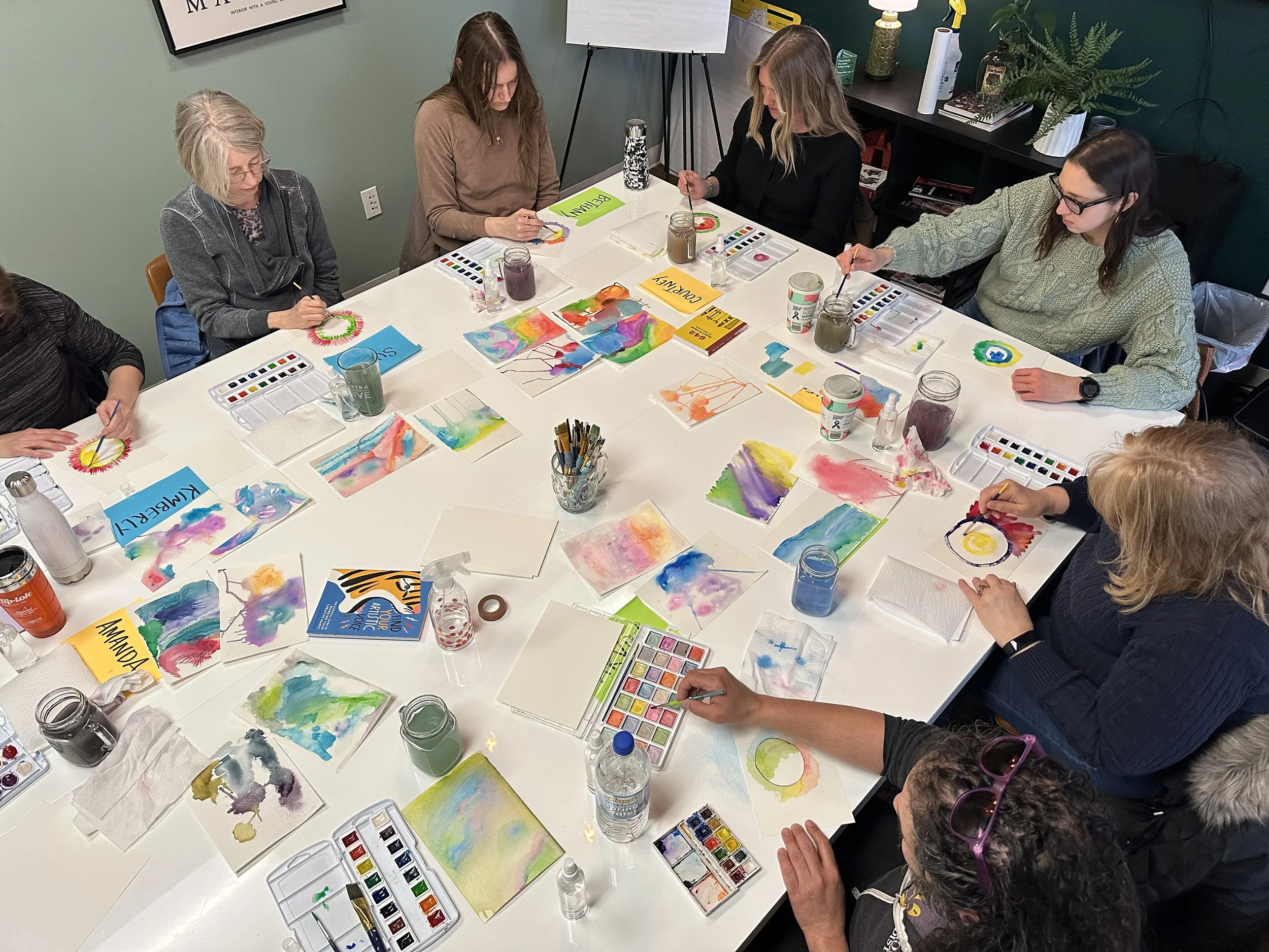 My workshops are guided, process-based art experiences that invite people to slow down, reconnect with themselves, and explore what’s present through creative expression.